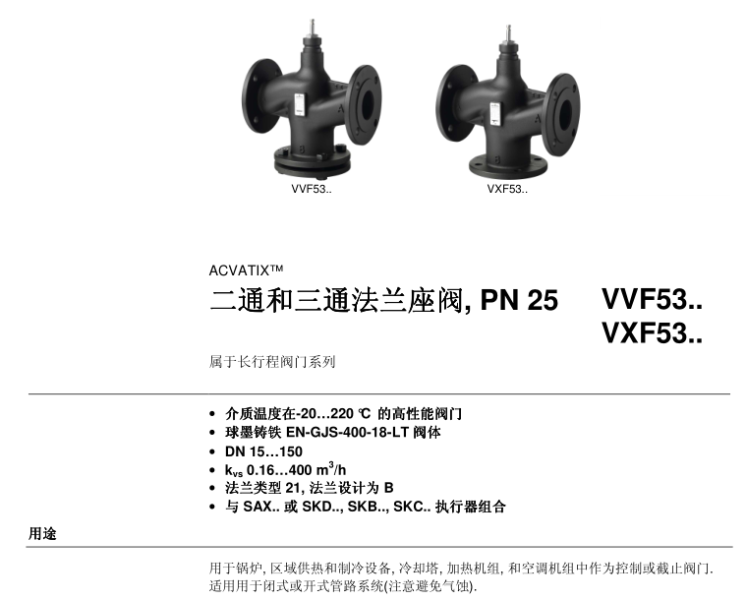 用于锅炉,区域供热和制冷设备,冷却塔,加热机组和空调机组中作为控制或截止阀门,适用于闭式或开式管路系统(注意避免气蚀)。